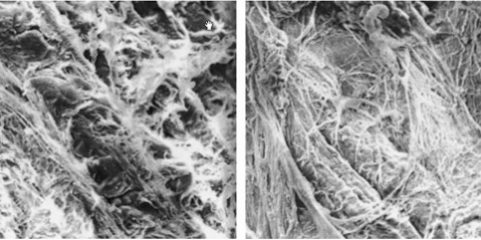 This is also graphically demonstrated in the following pictures from the seminal work of Järvinen et al from 2002. Picture A illustrates the orientation and distribution of collagen fibres in normal healthy fascia. We can appreciate the collagen fibres running in three different, distinguishable orientations as separate entities in normal perimysium (at very high magnification). In Picture B, the perimysial fibre network is obliterated. The different orientations of the collagen fibres cannot even be differentiated from each other! What’s more shocking is that it took a mere three weeks to go from A to B! (Taken from Organization and distribution of intramuscular connective tissue in normal and immobilized skeletal muscles. Järvinen et al. Journal of Muscle Research and Cell Motility. 23:245-254. 2002).