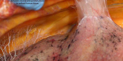 You’ll easily recognise the difference between densification and fibrosis in the following fantastic picture from the great Gil Hedley from 2010. Both are graphically demonstrated, so close together in a fresh-tissue dissection of the (lung) pleura.